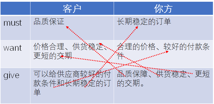 前一章案例分析中,如果了解到跨国公司的“must”是品质保证,“want”是价格合理、供货稳定、更短的交期,“give”是较好的付款条件和长期稳定的订单。与己方的“must”:长期稳定的订单;“want”:合理的价格、较好的付款条件;“give”:品质保障、供货稳定、更短的交期,有些条款是错位的,牺牲一些次要目标,是为了保护主要目标的达成。对自己不太重要的条件让步换取最需要的条件,例如以我方的“give”品质保障、供货稳定、更短的交期获取对方“must”和“want”。相反,对方的“give”较好的付款条件和长期稳定的订单可以获取我方“must”和“want”,最后得到双方都满意的双赢结果。如图3-3所示。