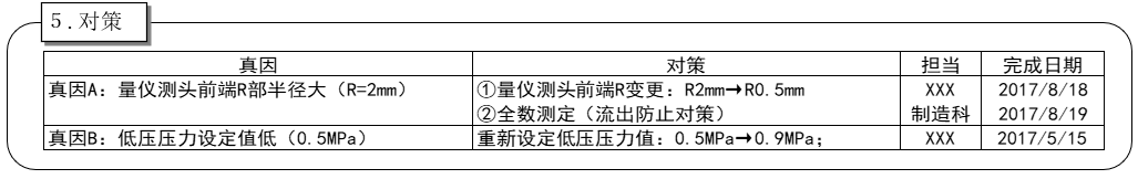 解决问题的“A3报告”中的应对措施实际上是一个解决问题的行动表,行动表的主要内容有造成问题的真因、每个根源的解决方案、负责人、完成时间。