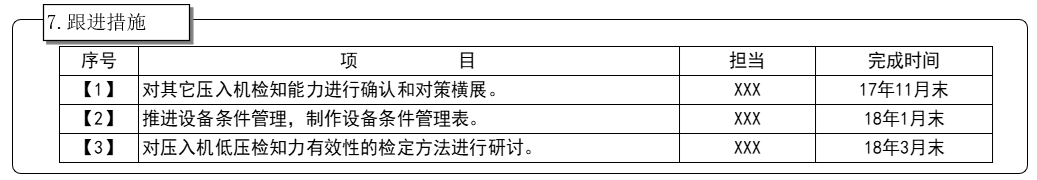 跟进措施包括如何保持改进的结果?如何让其他人知道改进的对策,使类似的流程也能得到改进?是否还有类似的流程?如何有效地沟通?将对策进行横向展开,使其产生最大效益。
