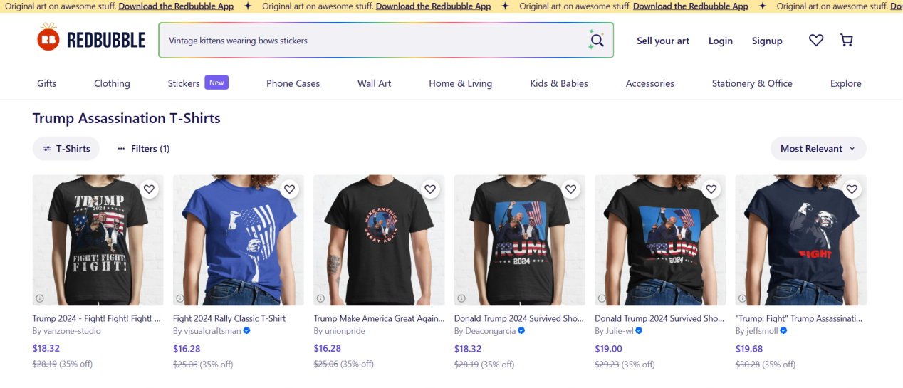 中小出海企业要时刻关注国际市场的动态和趋势,把握时机选择合适的产品。找到进入市场的最佳时期至关重要。举例来说,在2024年美国大选期间,有人在独立站发布热点新闻事件的印刷T恤(如下图所示的特朗普遇刺事件T恤),获得了巨大成功,这就是抓住了选品的“天时”。