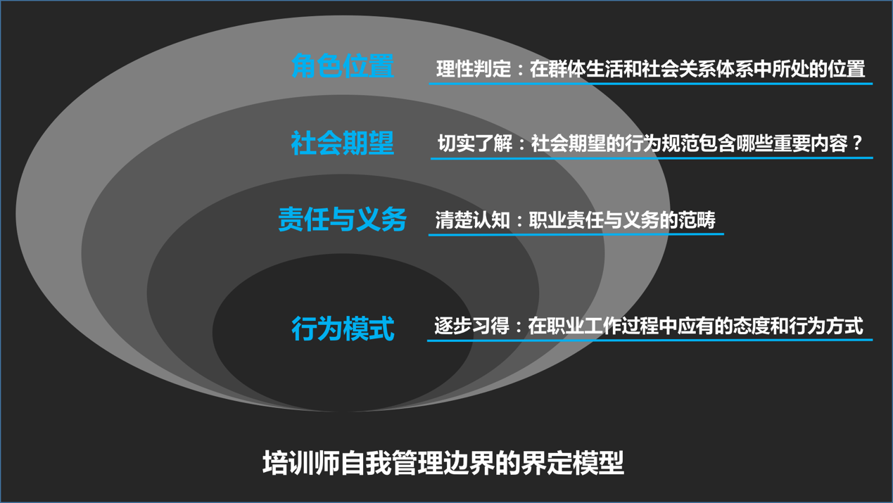 需要补充说明的是,在具体到行为模式层面之前,我们首先需要对自己(即培训师)的角色有一个理性判断,即此角色到底在群体生活和社会关系体系中处于什么样的位置?然后进一步了解,社会对此角色的行为规范期望包含哪些重要的内容,并据此对职业角色的责任和义务的范畴有一个清楚的认知。最后,才能确定应该秉持的态度和行为方式。