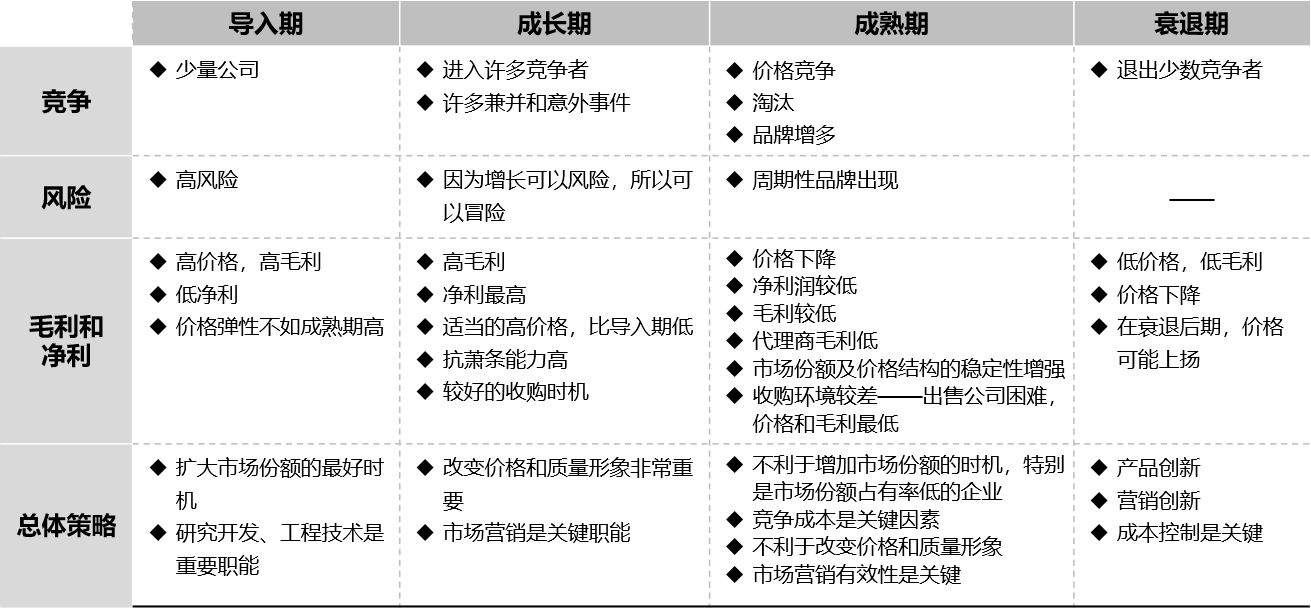 产业生命周期通常可以划分为导入期、成长期、成熟期和衰退期四个阶段,每个阶段都有与其相对应的鲜明特征,用于寻找战略机会和最佳的投资时机。如图4-42、表4-7所示。