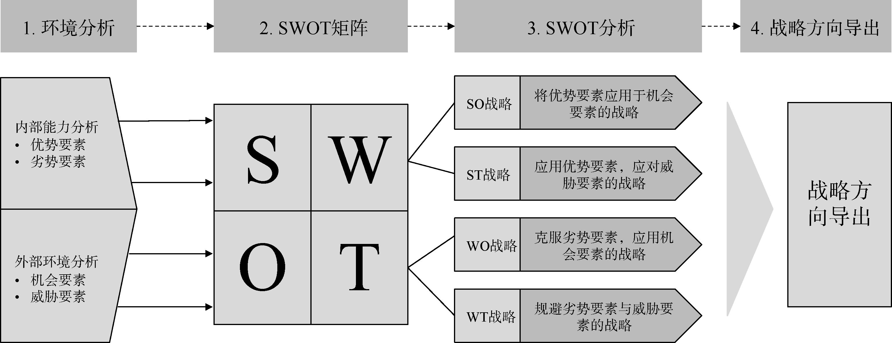 第二步是 SWOT 矩阵。这一步是基于第一步环境分析处理过的信息,做汇总、分析,提取有价值的信息点,形成 SWOT 矩阵,如图 2-3 所示。这一步也是战略规划必须做的基础活动,一般企业在做战略规划的时候会将其完成。