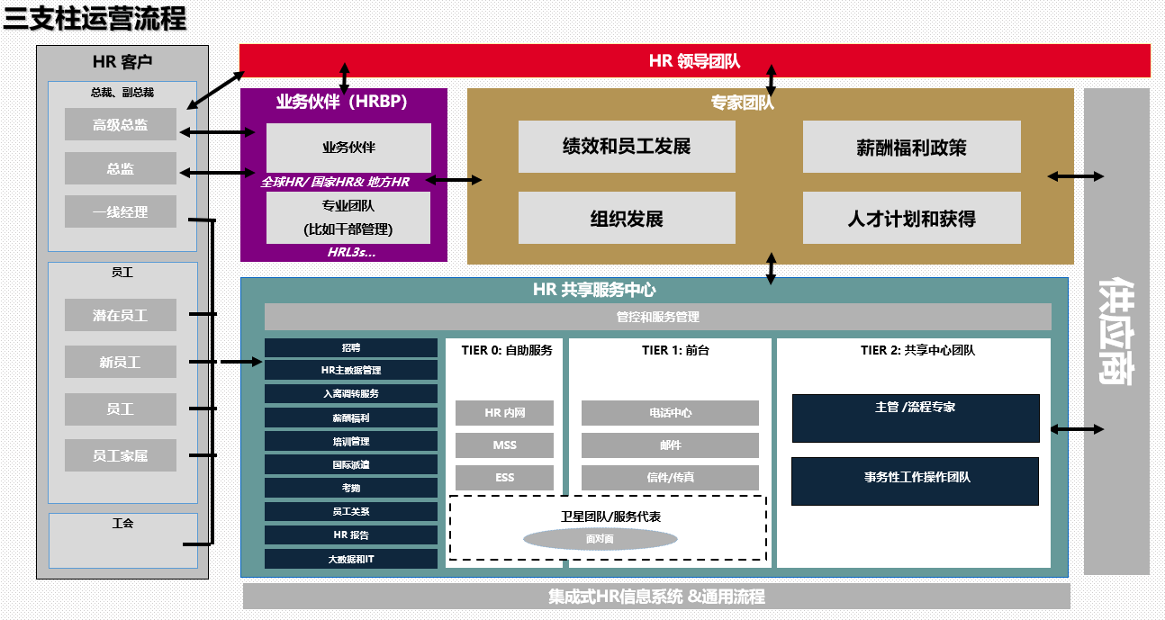 这种模式下,BP 在前端对接业务需求,COE 和 SSC 在后端提供专业支持与事务交付,形成 “战略 - 专业 - 事务” 的三层分工体系。例如,阿里通过对离职员工的持续关怀,将其转化为企业 “生态客户”,这种延伸服务正是三支柱模式下客户思维的体现。