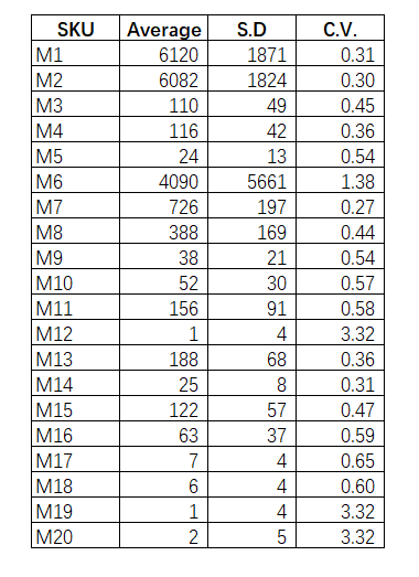 同样,某公司对20个SKU进行ABC分类之后,希望继续对此进行XYZ分类。那么列出其过往12个月的需求数据,并对此计算出平均值(Average)和标准差(Standard Deviation,简称S.D.)。标准差数值越高,代表着该序列越不稳定。