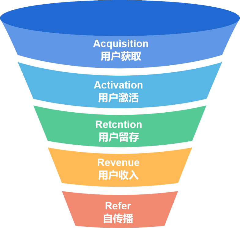 从用户增长各阶段切入,包括Acquisition用户获取、Activation用户激活、Retcntion用户留存、Revenue用户收入及Refer自传播。