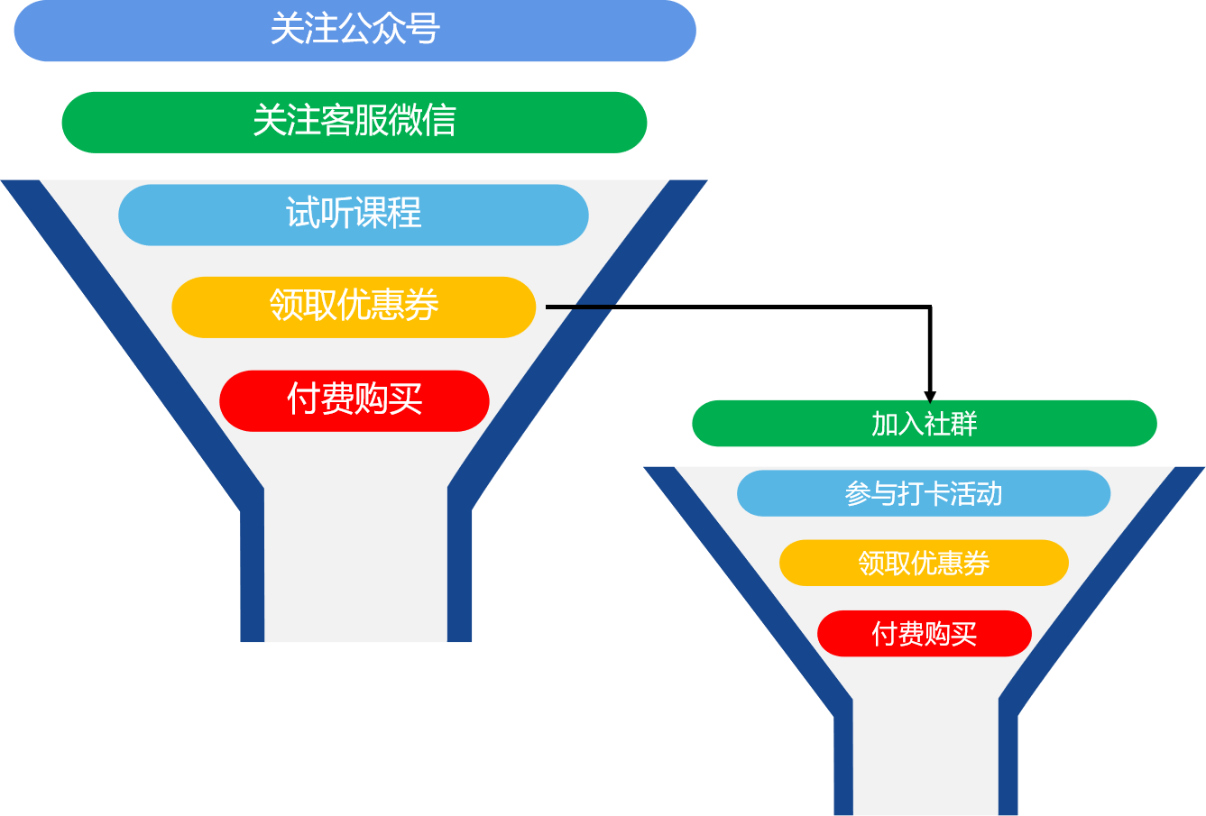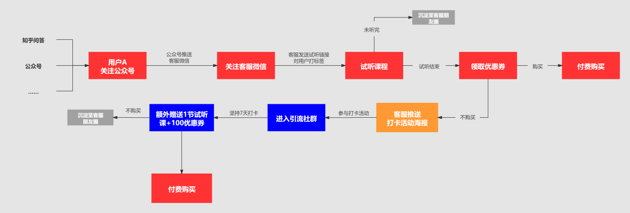 加入社群→参与打卡活动→领取优惠券/试听课→付费购买。