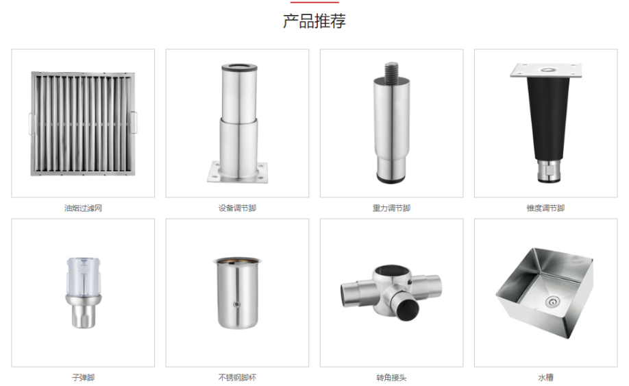 这家公司列出的产品列表里,只有“油烟过滤网”、“设备调平脚”、“设备脚轮”、“不锈钢水槽”、“不锈钢地漏”等等,似乎找不到逻辑关系;但查看公司简介,我们可以注意到这句关键的描述——“不锈钢类餐饮行业设备配件”。