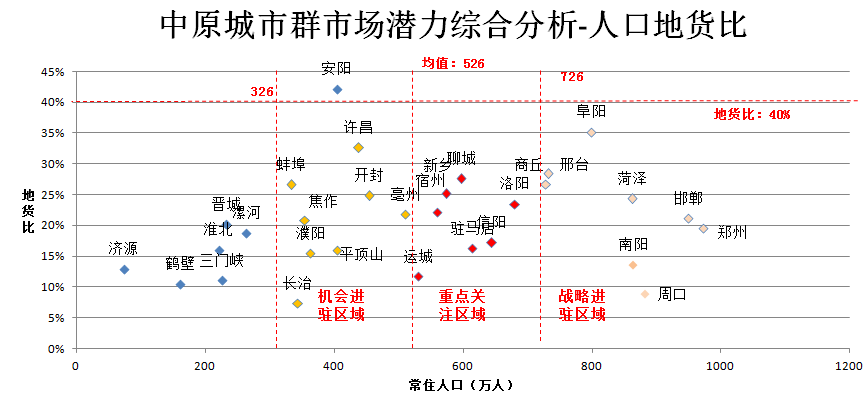 市场潜力从常住人口和地货比两个维度考虑,地货比较低且人口规模相对较大代表市场潜力较大。战略进驻区域城市共3个,分别为长治、濮阳、平顶山;重点关注区域城市共3个,分别为运城、驻马店、信阳;机会进驻区域城市共3个,分别为南阳、周口。