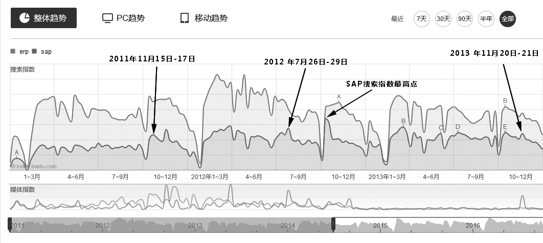 我们仍然以ERP行业为研究对象,看看百度指数是如何使用的,之所以选择这个行业,一方面管理软件与每个企业都相关,另一方面我手头有大量的ERP行业客户(SAP公司的代理商们)可以佐证数据的真实有效性。
