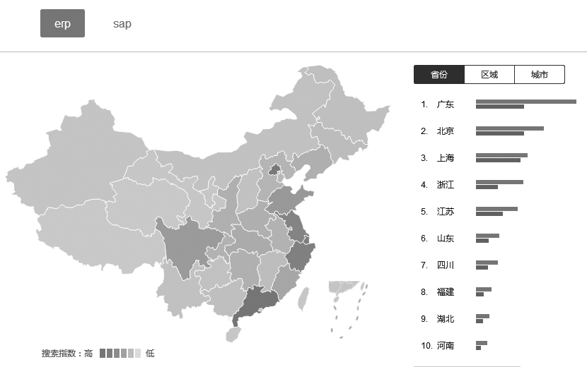 按省份画像,ERP一词广东省的关注度最高,其次是北京和上海两个直辖市,也体现出经济发达地区,ERP的需求也越多,如图7-9所示。