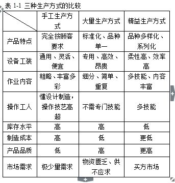 发展是永恒的,大批量生产方式否定了手工生产方式,精益生产方式又否定了大批量生产方式。三种生产方式的比较,精益生产方式综合了手工生产方式和大批量生产方式的优点,克服了两者的缺点,使它成为新形势下最有生命力的生产方式。表1-1对三种生产方式作了简明对比。