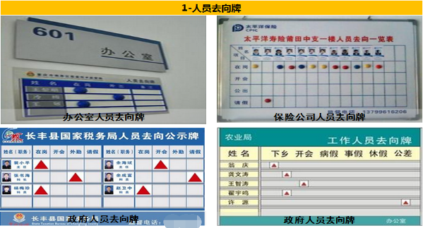 ①有去向牌的区域要设立管理责任人,方便提示大家养成习惯,离开办公室/岗位要说明去向。