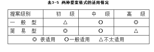简易型和一般型提案格式的适用性可以简单地加以区别,即简易型比较适合初中级水平的提案,而一般型比较适合中高级别的提案。
