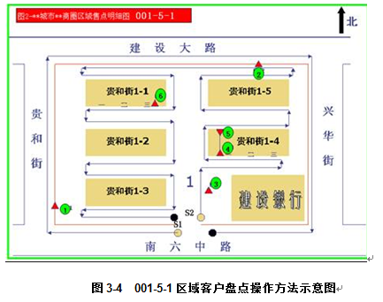 ① 通路普查时,S1为起点,先围绕该区域边线,按右手原则,逐家进行盘点,一直到S2点,并将盘点的1.2号客户标在图3-4上。