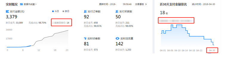 (3)商品。商品是非常重要的地方,涉及商品数据及商品打造爆款分析。所以这里必须要每天都看,而且这上面的数据可以看出商品销售情况及金额,还有商品排行里面非常重要的转化率、展现次数、访客次数、支付转化、支付金额、支付件数等。如图10-14、10-15所示。