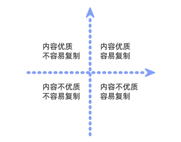 同行永远是最好的老师。模仿同行的内容之前,需要仔细观察和分析他们的作品,关注他们的视频主题、拍摄手法、剪辑技巧、配乐运用等。每一个同行的视频都有一套独有的内容框架,因为有了框架才便于复制。每条视频都像是一个填空题,成熟的创作者会根据内容框架,每条内容用填空的方式把不同的内容填充进去,形成一条新的原创视频。我们需要通过观察,了解同行的框架和拍摄难度,用来评估是否适合自己进行借鉴和复制,了解他们成功的原因和受众的喜好。通过观察同行的作品,可以从中发现一些通用的成功元素和创作技巧,并从中获取灵感和启示。我们可以把一个同行的视频分为四个象限,如图4.1所示。