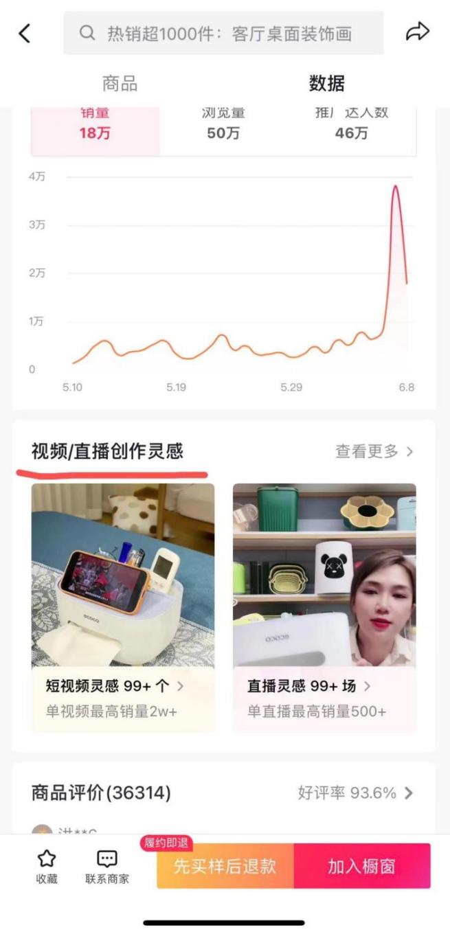 我们的目的是找到自己产品的同类型产品或者同款,借鉴同行短视频的创作风格,所以不需要过于纠结关键词,同品类就可以。随便选一个,比如“纸巾盒爆款榜第一名”,出现了如下同行产品列表,然后选择按销量排序,也就是推广效果最好的产品,从第一个开始点开,下滑到视频/直播创作灵感,如图4.3所示。