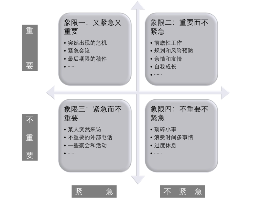 下图是多数人都知道的时间管理优先矩阵: