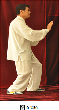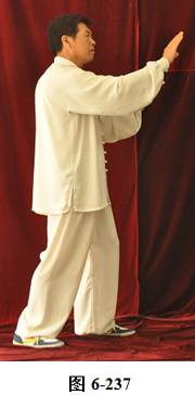 接上式,腰微含,向东南稍转,两手随腰外翻转向稍东南,变为横立掌,两手心均向内,成护胸腹之式。腰微含回转,朝向正东, 两手臂随之回转划一小圆,旋翻手心向下,腰向下沉,屈膝成半蹲式,两手臂随之下沉,成斜向前立掌。腰微上提两臂随之前撮,腰向左、右外撑,重心移于左腿,右膝微屈,两臂随腰左、右外撑划立圆。腰向下沉,两臂向下划至两膝旁,两腿随腰下沉,成半蹲状。腰上提,两臂随之上搂,双手成交叉状至面部前,重心立于左腿, 提右膝,抬右腿,腰向后微含,两臂随之向左右外开,两手旋翻掌心向外, 略宽于肩, 右脚尖随之向稍东南方慢慢踢出(见图6-233至6-239)。