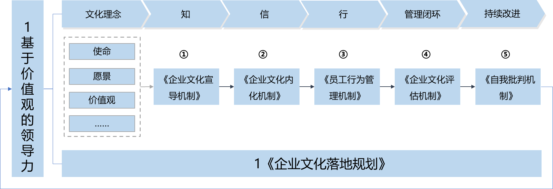 “1+1+5”的闭环管理体系中,领导力是根本,是文化落地的主导因素;《企业文化落地规划》负责指明整体方向与思路;《企业文化宣导机制》《企业文化内化机制》《员工行为管理机制》对应“知-信-行”的文化管理逻辑;《企业文化评估机制》是保障目标实现的闭环管理机制;《自我批判机制》是推动企业不断发现问题、解决问题,循环改进的机制。七个方面综合考虑了当前与未来、科学与艺术、刚性与柔性,共同构成系统、清晰的文化管理体系。