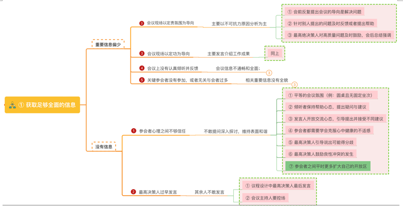 第一,最高决策人要在会议正式开始前反复强调我们是解决组织问题为导向的会议。我们的目标是一致的,在这里描述在工作中遇到的各种问题并进行解决,从而推动组织的进步。这个优化方向理解起来容易,但真正会议中需要大家按此导向照做确实非常困难。因此,我们要不断宣贯、诠释,组织会议的前期可以在会议通知中单独高亮“会议导向”这一部分内容,说明会议目标主要是展示真实的数据与全面的信息,共同商讨问题的解决对策。在会议现场正式开始之前还是要有会议最高决策人再次诠释,让大家知道我们是真的很重视问题的解决,我们不是随便在会议通知上写写而已,对我们来说会议中每一个呈现出来的高质量问题就像一个礼物,拆开这些礼物找到答案才是我们想要的。即便如此,我们还是常常会被心中“定功与追责”惯性所驱动,在会议讨论的过程中一定要压下这一想法。