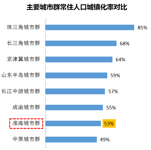 目前,淮海城市群常住人口城镇化率为53%,低于我国常住人口城镇化率57.4%。