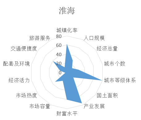 从城市群投资潜力雷达图可以看出,淮海城市群的城市等级体系、产业发展水平以及财富水平较高,但人口、经济等其他维度均较低。