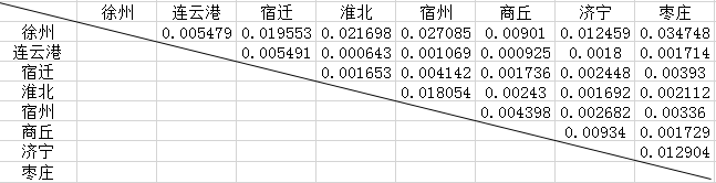 从淮海内部城市经济联系强度表可以看出,徐州和枣庄(0.035)、徐州和宿州(0.027)、徐州和淮北(0.022)等城市联系较为密切。从整体来看,徐州相对于其他城市和周边城市联系较为密切。