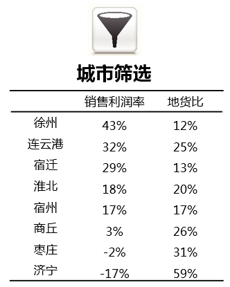 根据九宫格阶梯筛选法则,处在阶梯阴影区为重点拓展城市:徐州处在扫货区与进取区交界,应重点关注;黄线框内的重点投资城市,主要包括商丘、宿迁、枣庄、连云港;挑货区的重点拓展城市有淮北、宿州。
