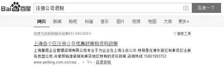 另外,对于客户常遇到的问题,我们在自己的网站上都做了相应的回答,并对这样的回答页面做了优化和推广。如图8-15所示,有人搜索“注册公司优惠政策”,或者如图8-16所示,搜索“注册公司退税”,宋律师的网站都排名在百度第一位。