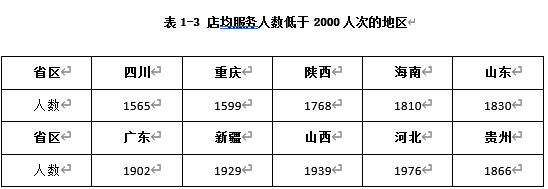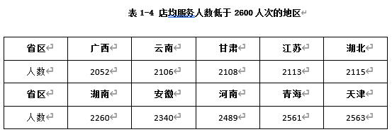 3.店均服务人数低于2600人次的地区有10个(见表1-4)。