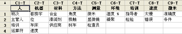 (1)将表面缺陷产生的原因从人、机、料、法、环、测六个方面分析,将分析的结果写在相应的Minitab工作表内,如表1-6所示。