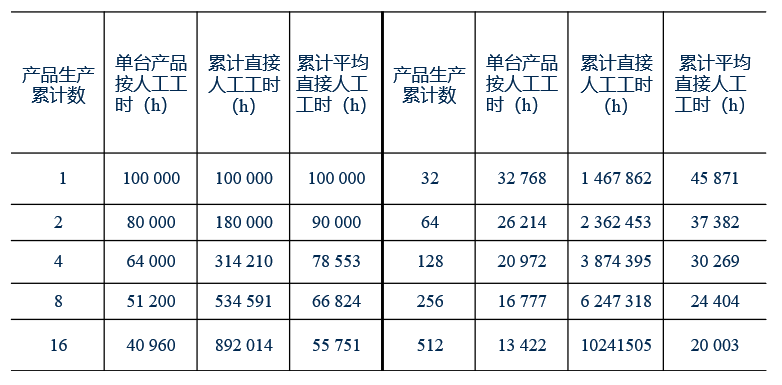 式中,Y为生产第X台(件)产品的工时;K为生产第1台(件)产品的工时;C为工时递减率或学习 率;X为累计生产的台(件)数;n为累计产量翻 番指数。