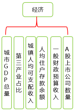 我们选取了和城市投资潜力相关的11个一级指标和40个二级指标纳入评价指标体系,并将它们聚合分析形成五大模块的分析指标。各模块主要指标如下: