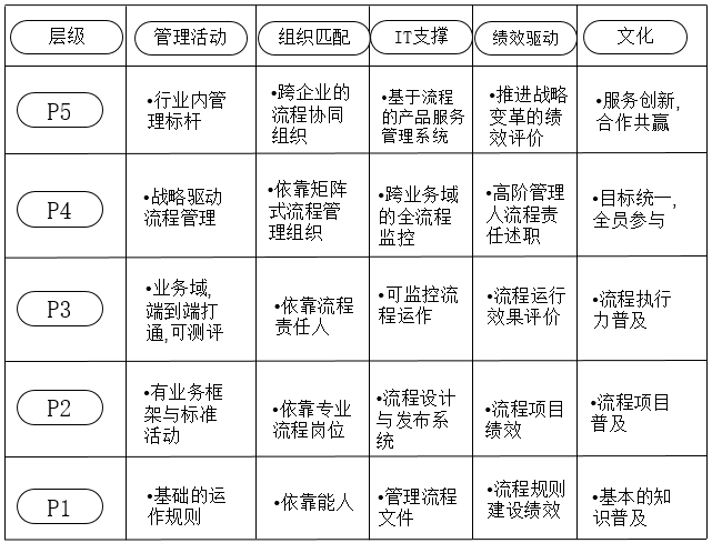 既然谈到流程管理成熟度,我从个人理解的角度来分享下流程管理成熟度衡量模型。