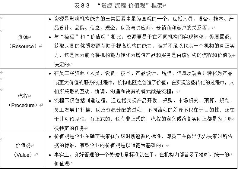 克莱顿·M. 克里斯坦森教授则认为,组织能力往往受到资源(Resource)、流程(Procedure)、价值观(Value)三类因素影响,被称为“资源-流程-价值观”框架,如表 8-3 所示。