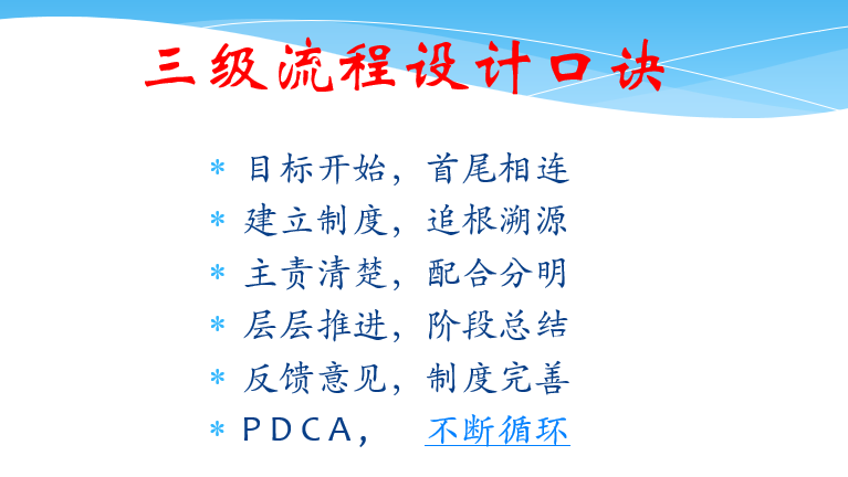 三级流程设计口诀:"目标开始首尾相连,建立制度追根溯源,主责清楚配合分明,层层推进阶段反馈,意见制度完善 PDCA 不断循环。"