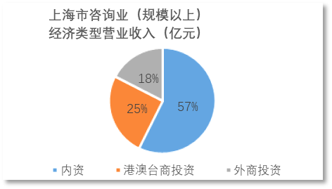 2022年,上海市咨询业(规模以上)内资企业、港澳台投资企业、外商投资企业的营业收入各占比重为57%、25%、18%。