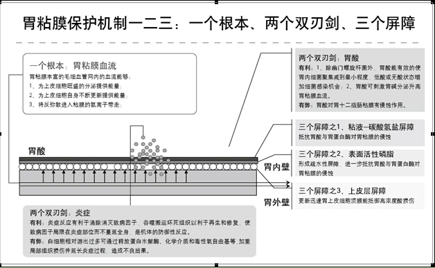 为了提升产品的地位,为了让医生认同“增强胃粘膜血流”这个机制很重要,为了让医生容易形成记忆,我首先把胃粘膜的损害和防御机制做了一个总结和提炼,把所有的医学观点和研究结果进行分类整理,逻辑归纳,最后总结出“胃粘膜保护机制的一二三:一个根本、两个双刃剑、三个屏障”,如图5-9所示。