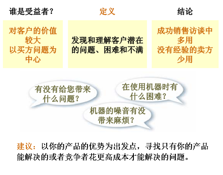 什么是问题型提问?询问客户面临的问题、困难、不满,比如工人在操作机器的时候有什么困难?机器的噪音有没有带来什么麻烦?你认为还有什么地方需要改善?问题型提问同样有开放和封闭两种方式。