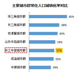 目前,长江中游城市群常住人口城镇化率为57%,与我国常住人口城镇化率基本持平。武汉、长沙、南昌三地城镇化率均高于70%,分别为80%、76%及72%。长江中游城市群到2020年城镇化率将达到60%,预计有330万人实现城镇化。如能达到长三角城市群68%城镇化率水平,预计有1360万人实现城镇化。