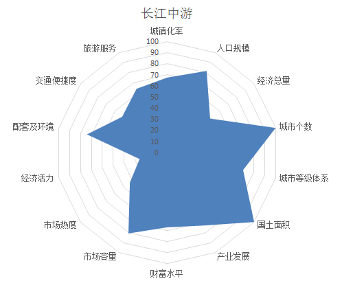 从城市群投资潜力雷达图可以看出,长江中游城市群是国内较具有发展潜力的城市群,除经济总量、经济活力情况外,其他12个维度发展较均衡。