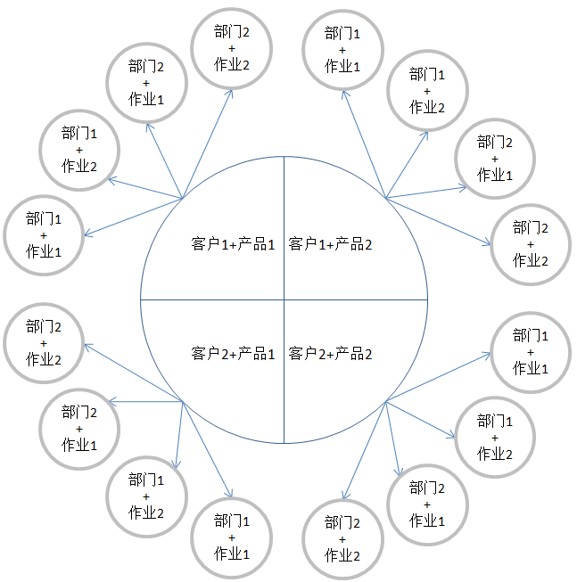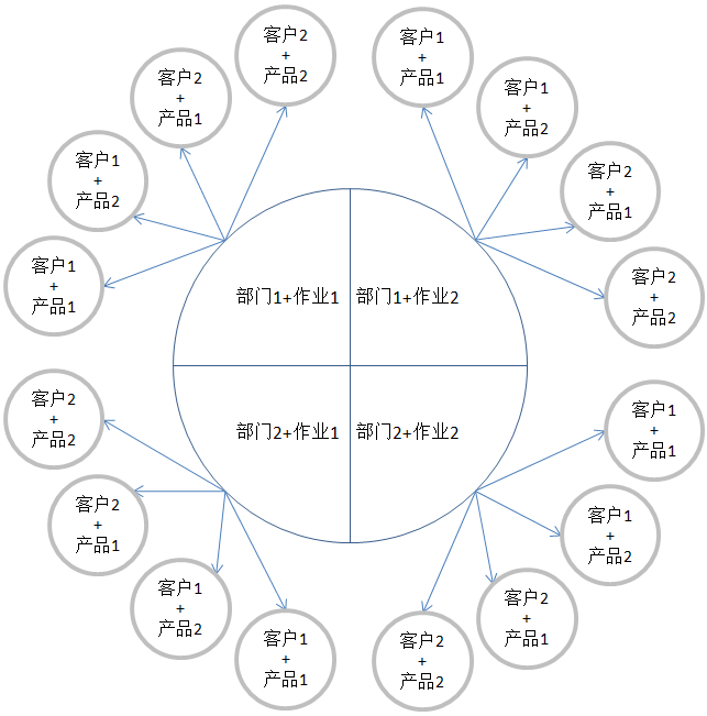 为客户提供产品,是公司正常运营的外在牵引力;由部门提供作业,是公司正常运营的内在支撑力。客户、产品、部门、作业的多维组合,体现了公司外在牵引力与内在支撑力的结合,即内外贯通,包括: