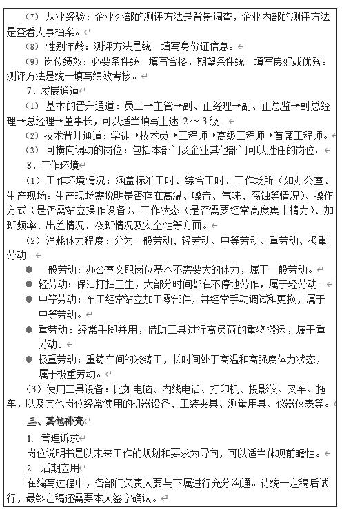 岗位说明书的初稿,建议由填写岗位工作分析调研问卷的员工代表和该岗位的直接上级共同完成,随后统一提交给行政人事部审核,最后由岗位工作分析专项小组审核定稿并试行。