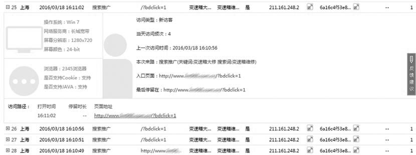 图8-9是XFM网站的访问数据,可以看出在3月18号16点11分左右,一个来自上海的访客在十几秒内连续用一个搜索词“变速箱维修”点击广告4次,但并不真正看网站内容,点了就走,是明显的恶意点击,用以消耗XFM的广告费。以这个词20多元的排名出价计算,十几秒就被点掉100元,这样的情况每天都在发生。