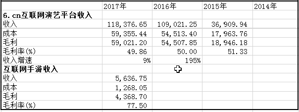 互联网演艺上,主要是收购的直播公司六间房和手游公司灵动时空,不幸的是六间房收入增速下滑明显,这也是事前大家预料到的。如表6-8所示。