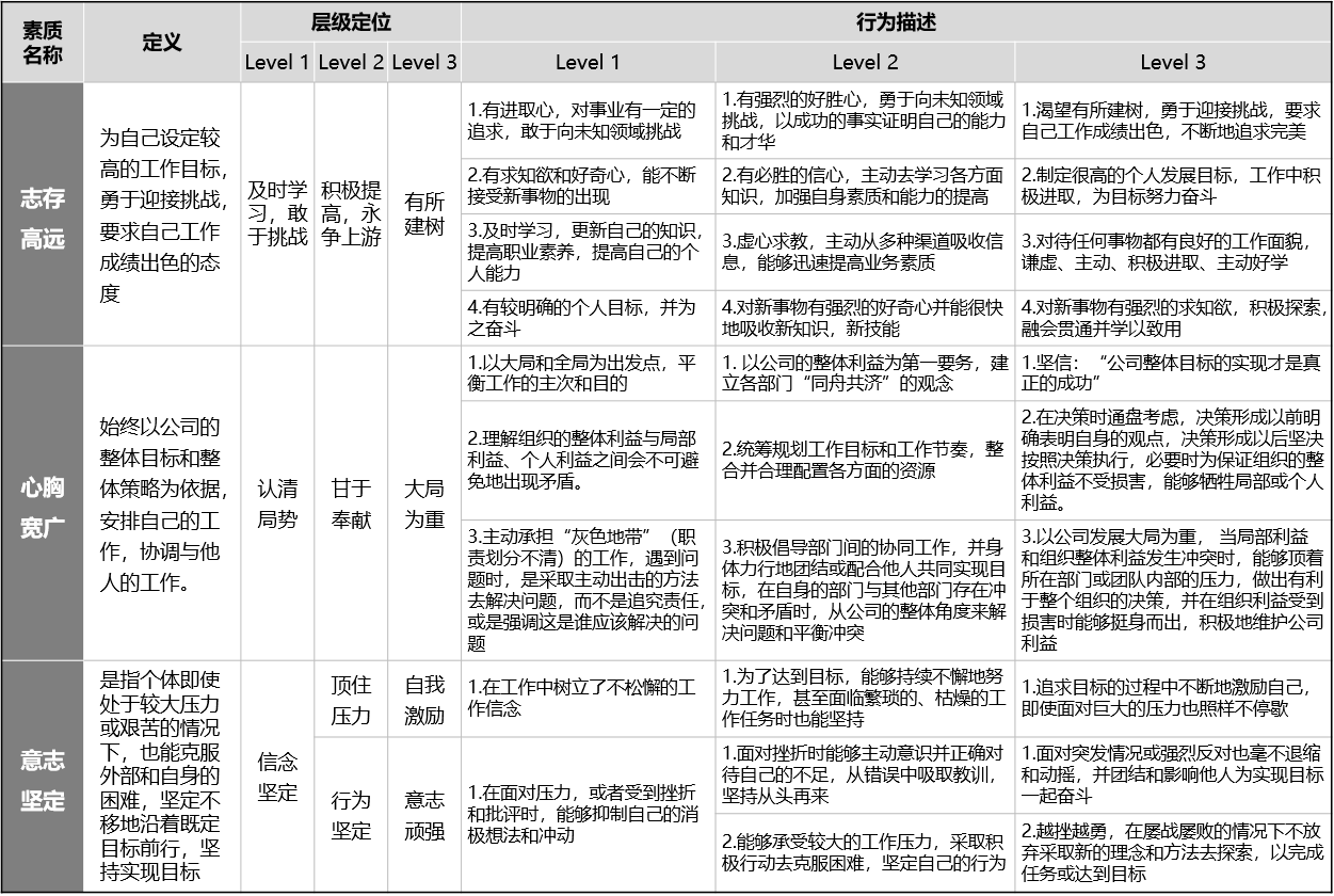 三个素质:志存高远、心胸宽广、意志坚定。如表1-2所示。