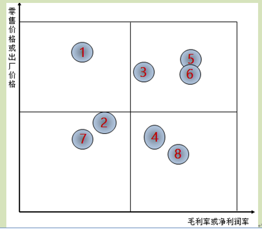 对所有药品进行价值排序,由于药企经营模式不同,坐标的内容有很大区别。比如以代理为主的,就不要以零售价格为坐标轴,否则就失去了排序的意义。综合考虑可控成本因素,对用毛利率还是用净利率作为坐标轴,可根据药企自己的财务习惯确定。