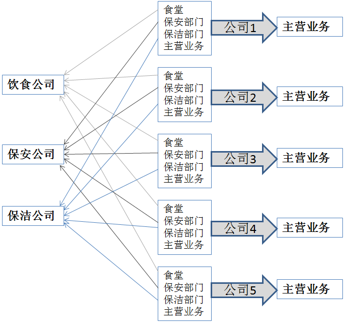 例如,有五家公司如公司1、公司2、公司3、公司4和公司5,原来都有食堂、保安部门、保洁部门和主营业务,交易成本是很高的,生产效率是很低的。现在这五家公司均将食堂、保安部门、保洁部门分离出去,专注于各自的主营业务,即由大而全、小而全转化为专而精;分离出去的相同部门则合并成立独立的饮食公司、保安公司和保洁公司,分别为原五家公司提供饮食、保安和保洁服务。这样,原五家公司的交易成本将大大降低,生产效率将大大提升;新成立的饮食公司、保安公司和保洁公司的服务也是更专业的,如图8-3所示。